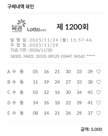 1200회 온라인 동행 복권 로또 인증!! (AI 추천번호)