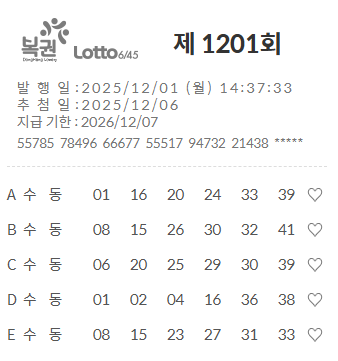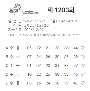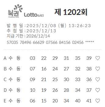 로또 1203회 AI 추천번호 5게임 참여해봅니다 ㅎ